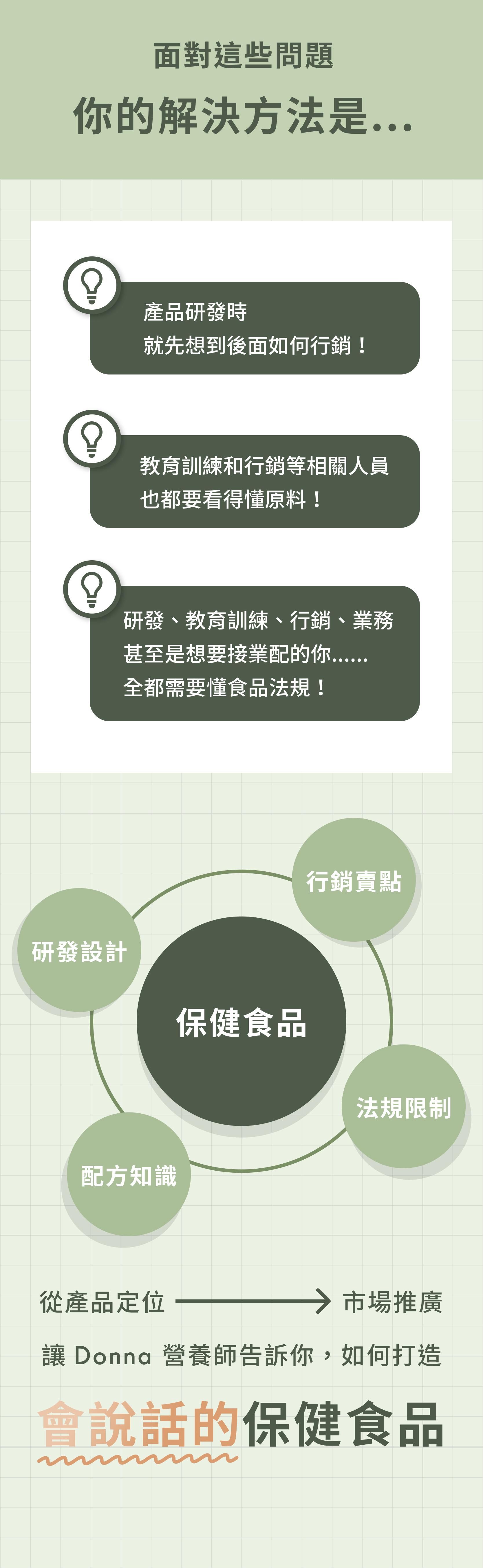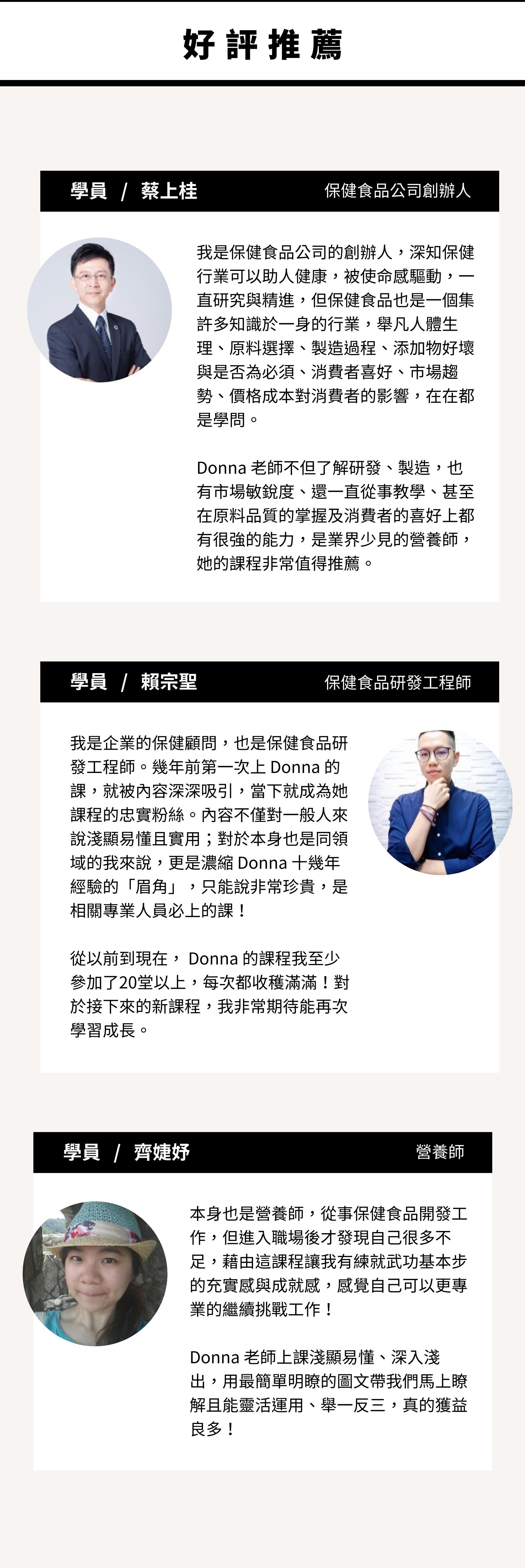 大家好,我是Donna,在保健食品產業工作至今18年,從保健食品的研發、製造、配方設計、文案、教育訓練、客服、行銷、臨床應用...等保健食品一條龍的過程我都有參與過。