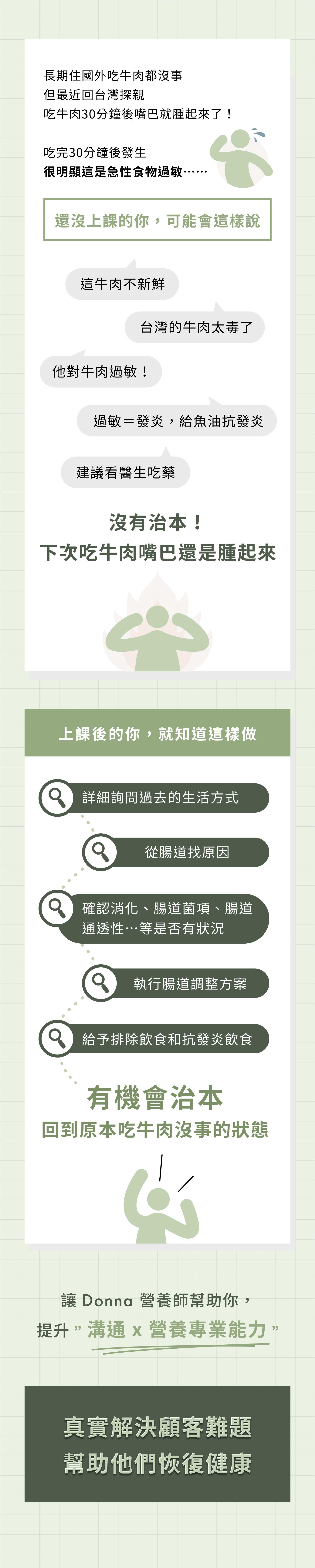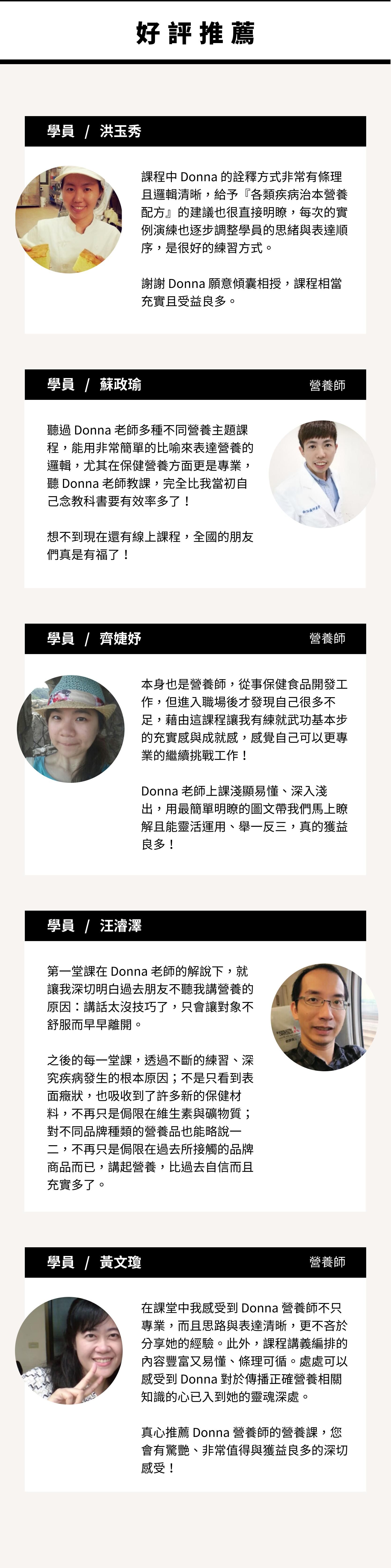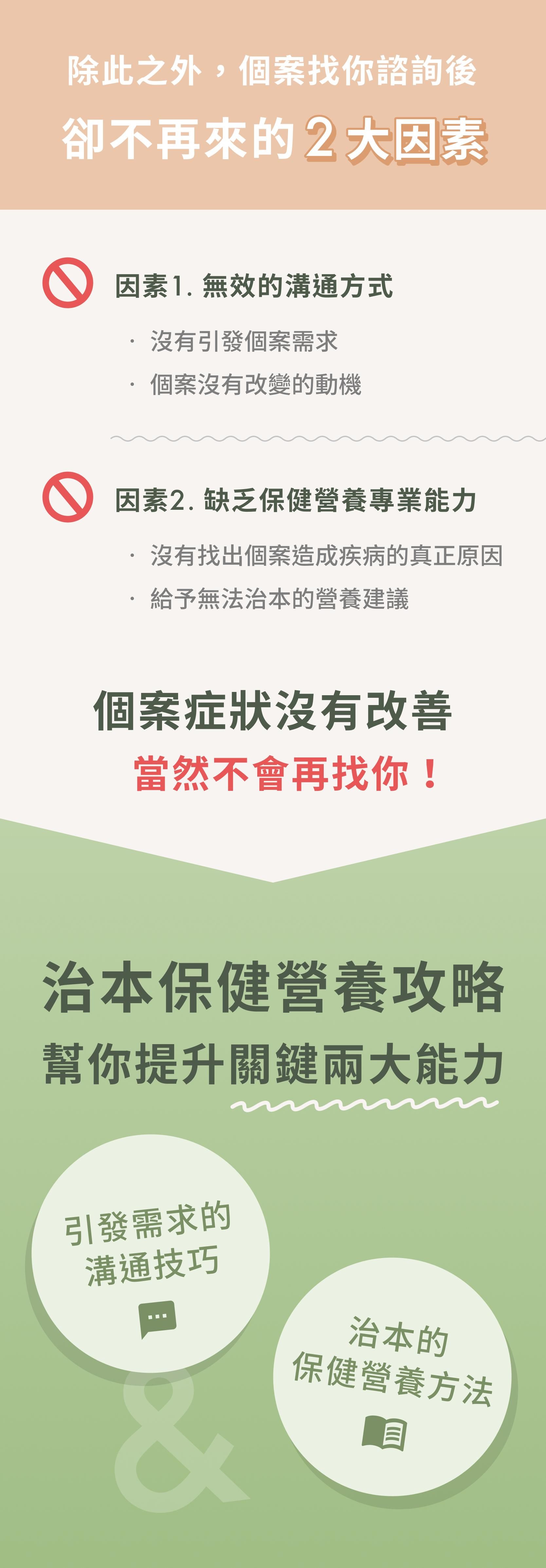 在擔任保健食品公司的專業講師 (營養師) 十餘年期間,輔導過藥局、有機店、醫美、醫院診所、傳直銷、藥妝店...等通路,我熟悉不同通路的溝通語言,且觀察到許多成功與不成功銷售者的特性,這些都是我往後教學時非常寶貴的教材,而也從中發展出一套獨特的教育訓練方式,這些年我利用這套方法協助了許多人提升保健營養專業能力與銷售業績,這套方法就是【治本保健營養攻略】。